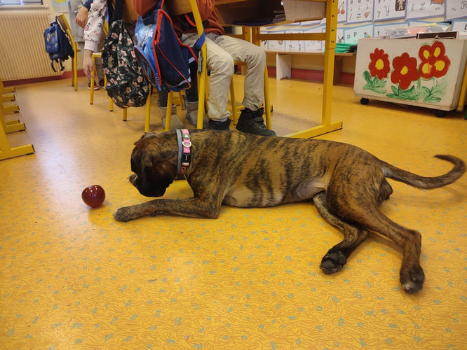 Notre compagne à quatre pattes vient ponctuellement en classe afin que chacun apprenne à interagir avec elle en toute confiance.