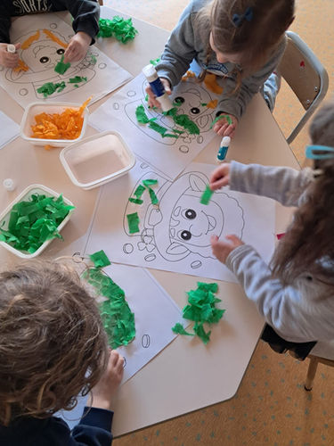 Les petites sections ont décoré un trèfle à quatre feuilles avec de la peinture aux doigts : chaque pétale devait être rempli avec une couleur différente. Ils ont aussi réalisé un chapeau vert et une barbe orange en papier crépon, ce qui leur a permis de s’entraîner à déchirer, manipuler et coller une matière nouvelle.