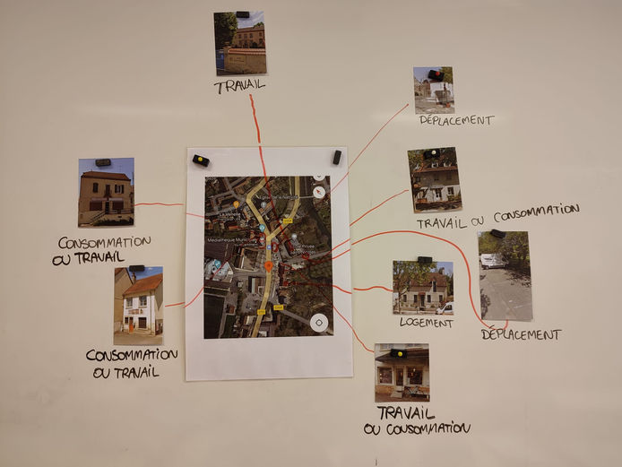 A l’aide d’une boussole et d’un plan du quartier, les enfants ont été amenés à se repérer et à photographier les bâtiments et signes d’informations relatifs aux quatre composantes de la notion « d’habiter » découvertes en amont (le logement, le travail, les déplacements, la consommation).
